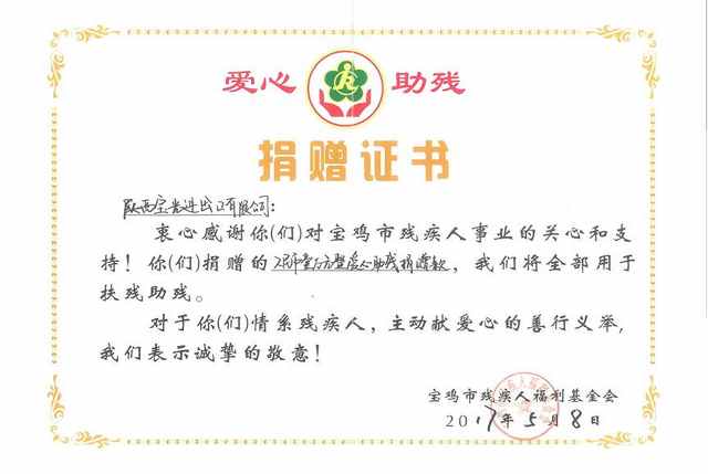 近日,寶雞市殘疾人福利基金會工作人員專程前來,為寶光進(jìn)出口公司送來了“愛心助殘捐贈證書”,并代表基金會感謝進(jìn)出口公司的捐贈行為。