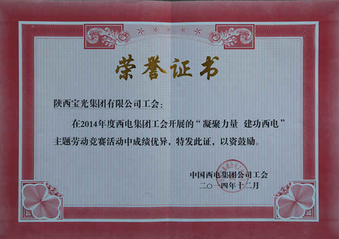 近日獲悉,在西電集團(tuán)召開的“凝聚力量、建功西電”2014年度勞動競賽活動先進(jìn)評選中,我公司工會等10個單位獲得西電集團(tuán)工會“凝聚力量 建功西電”2014年度勞動競賽活動優(yōu)秀單位,西電集團(tuán)工會為我公司頒發(fā)了榮譽(yù)證書。