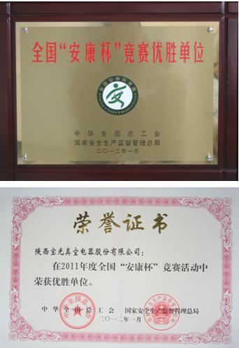 我公司榮獲2011年度全國“安康杯”競賽優(yōu)勝單位稱號。全國“安康杯”競賽活動(dòng)是全國總工會(huì)、國家安全生產(chǎn)監(jiān)督管理總局聯(lián)合開展的全國工業(yè)企業(yè)安全生產(chǎn)與職業(yè)衛(wèi)生健康活動(dòng)。自1999年開展以來,我公司已于2001年、2007年、2011年三次榮獲全國“安康杯”競賽活動(dòng)優(yōu)勝單位殊榮。