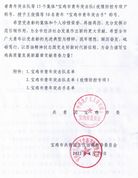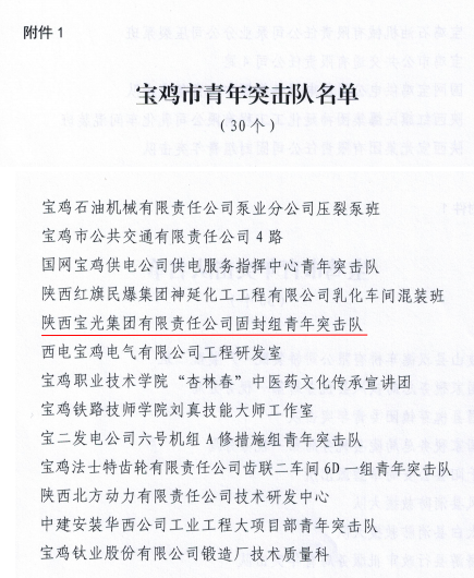 近日,從團(tuán)市委獲悉,寶光股份固封班組被授予“寶雞市青年突擊隊(duì)”榮譽(yù)稱(chēng)號(hào)。