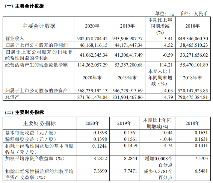 寶光股份2020年年度主要財務指標